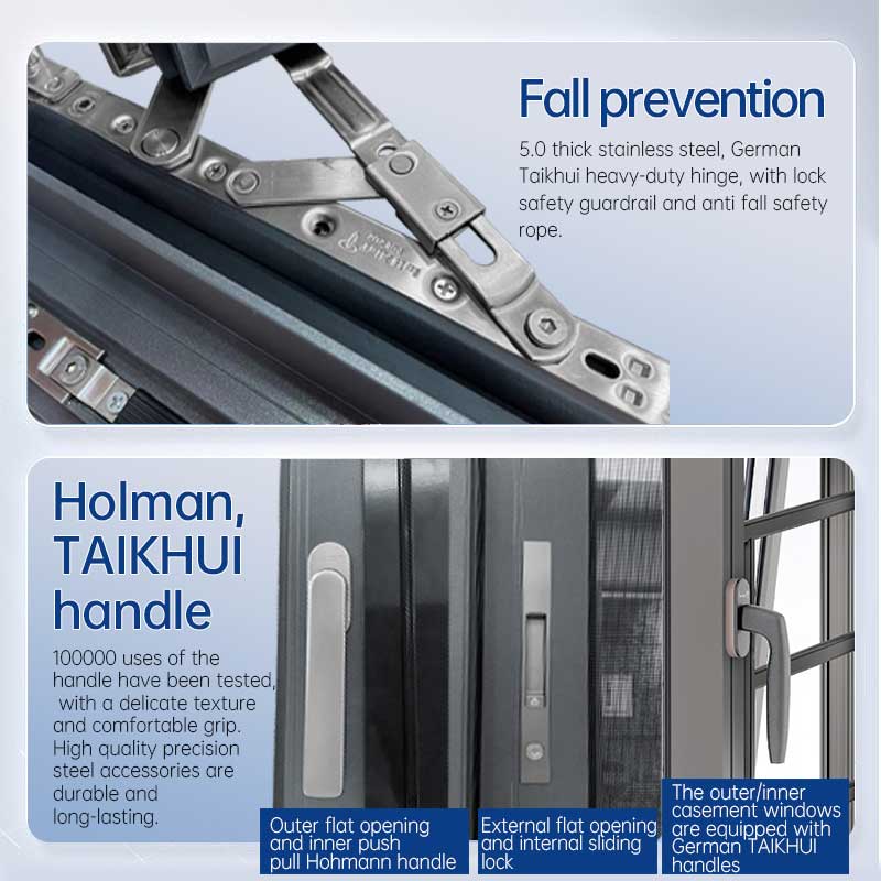 Ukryty projekt drenażu przetrwał próbę gwałtownych burz. Otwory drenażowe są bardzo ukryte. Konstrukcja odpływu drenażowego może być dostosowana w celu zwiększenia objętości i szybkości drenażu. Zapewnia nie tylko ogólną estetykę, ale także skutecznie zapobiega przedostawaniu się wody deszczowej do pomieszczenia, nie powodując przy tym hałasu. Siatka King Kong 304 lub siatka o wysokiej przepuszczalności zapewnia kompleksową ochronę przed kradzieżą i komarami. Szczegóły produktu odzwierciedlają doskonałą jakość, w tym zawiasy zabezpieczające przed upadkiem, antybakteryjne uchwyty i ostrą konstrukcję, zapewniając kompleksową ochronę bezpieczeństwa dla Twojej rodziny.
